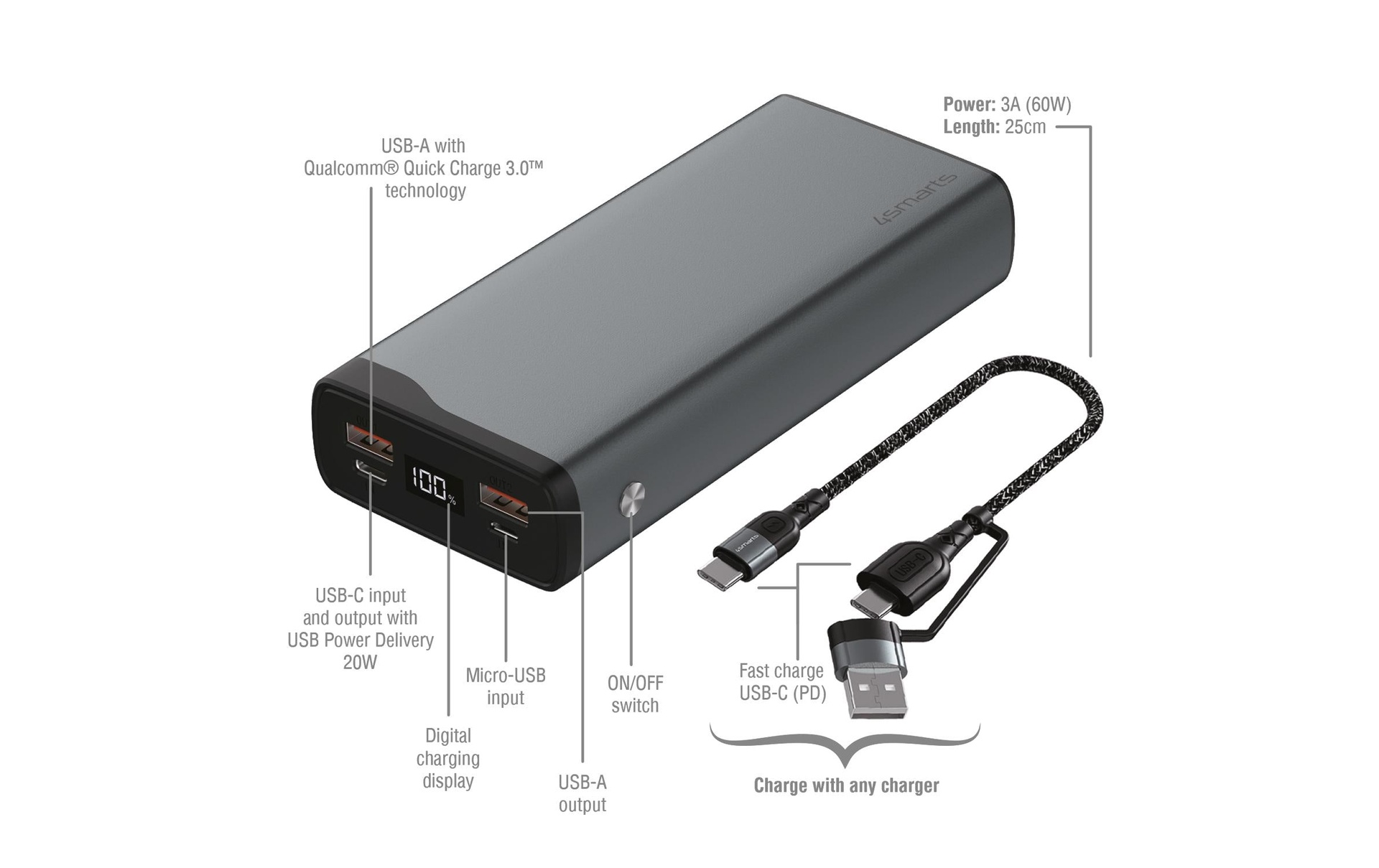 Type d'accu: Lithium-polymère (Li-Po) - Capacité de la batterie: 20000 mAh - Couleur de détail: Gris - Chargement par port USB: 3 - USB-C PowerDelivery: Oui - Output max. USB-C PowerDelivery: 20 W
