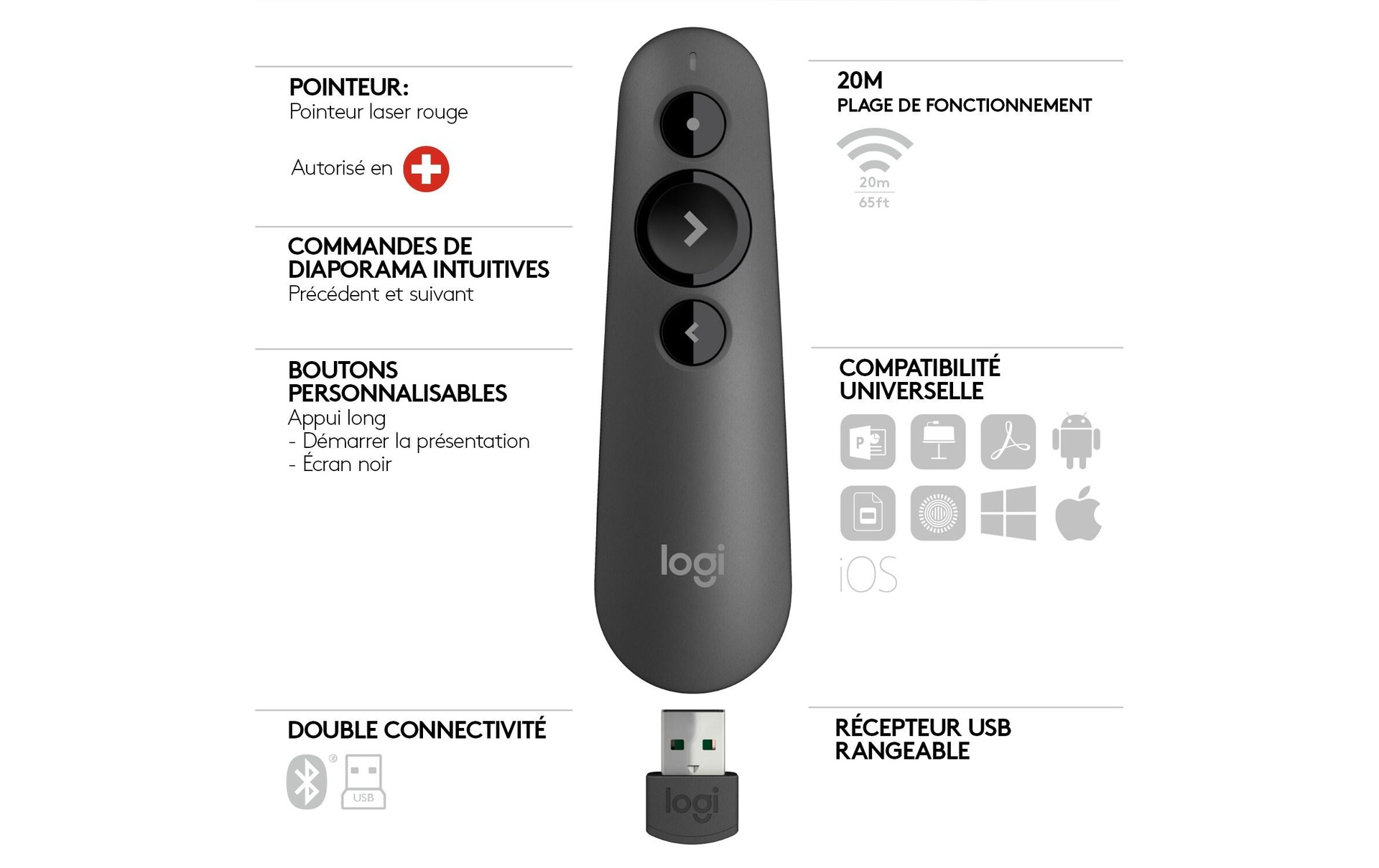 Présentez clairement, délibérément et intuitivement avec le Logitech R500, feuilletez vos diapositives et mettez en évidence les choses importantes avec le pointeur laser. Compatibilité maximale : Le Presenter fonctionne avec pratiquement tous les appareils Windows, MacOS, iOS ou Android et les logiciels de présentation les plus populaires. Connectez-le sans fil directement via Bluetooth ou via le récepteur radio que vous branchez sur un port USB disponible. Les deux types de connexion fonctionnent sur une portée allant jusqu'à 20 m.