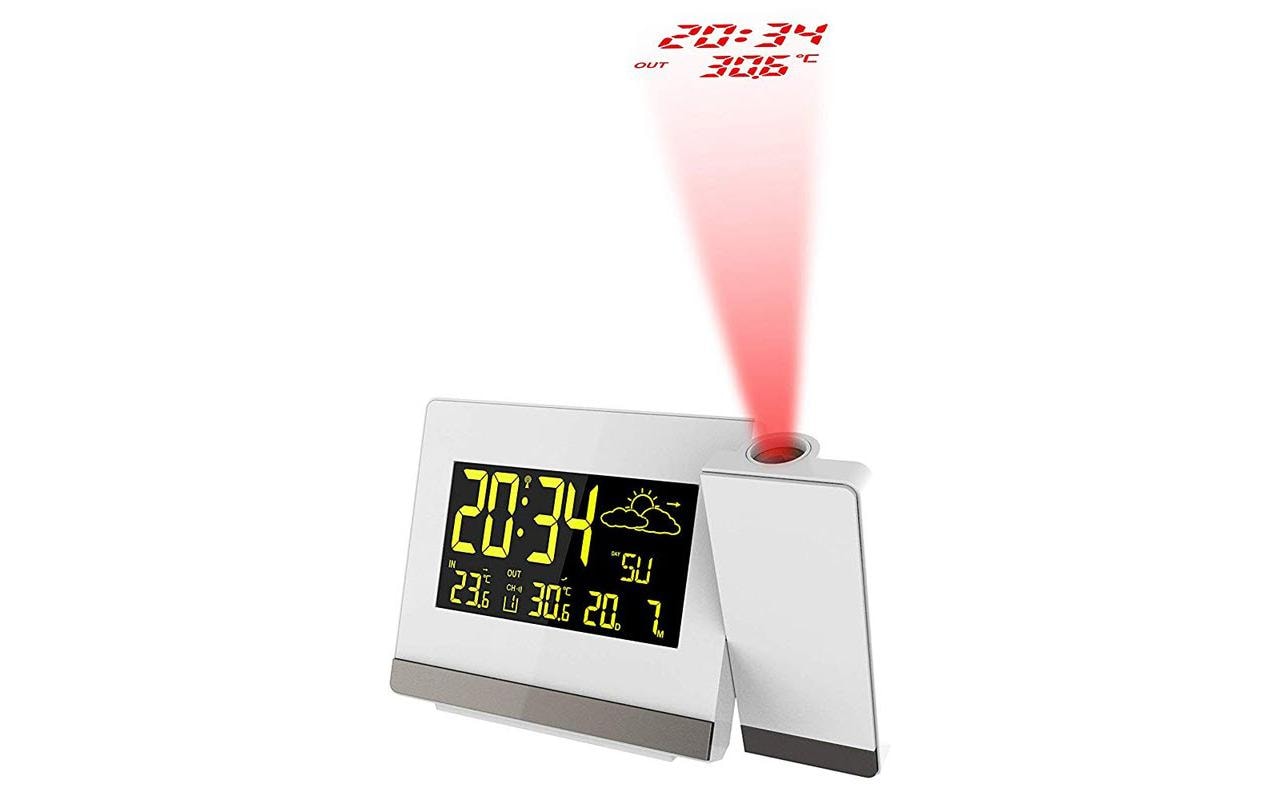 Horloge radio DCF-77 avec projection de l'heure et de la température extérieure - Affiche la date, le jour de la semaine, la température intérieure et extérieure - Affichage de la tendance des températures, prévision de la situation météorologique et de la tendance du temps - Alarme de réveil avec fonction snooze - Dimensions : 14.7 x 9.2 x 4.2 cm (LxHxP), émetteur : 6.5 x 10 x 4.2 cm (LxHxP) - 2 piles AAA Micro LR03 sont nécessaires (non incluses), adaptateur secteur (inclus), émetteur: 2 piles AA Mignon LR06 (non incluses)
