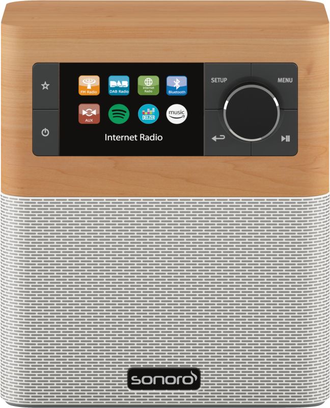 radio design, 20 mémoires émetteurs, réception DAB+, FM, restitution radio Internet, écran couleur de 2,4'', 6,1 cm diagonale, accès Internet aux services Online, Spotify Connect, fonction réveil, répétition de l'alarme automatique, Sleep-Timer, télécommande, Fonction de charge USB, certification DLNA, Bluetooth, raccord USB, interface WLAN, alimentation secteur