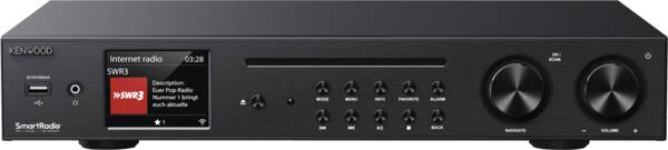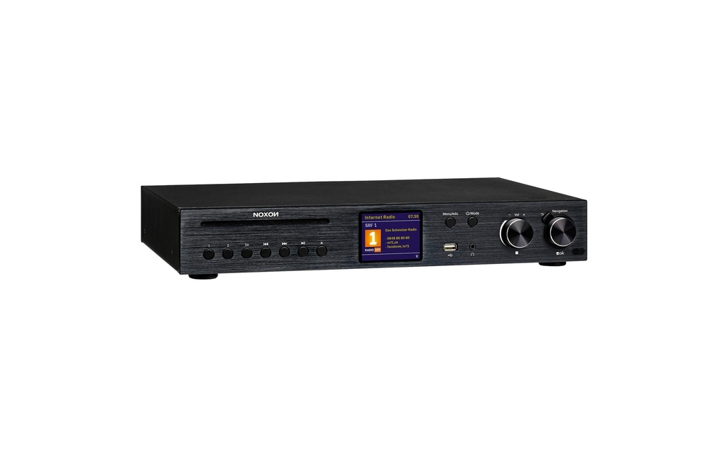 Ampli-Tuner-CD, puissance totale 60 Watts maxi, réception DAB, DAB+, restitution radio Internet, accès Internet aux services Online, partie radio RDS, réception FM, env. 8,12 cm écran, 3,2 Pouces, connexion Bluetooth, entrée tourne disque, prise casque d'écoute, connexion USB, à l'avant, Wireless LAN