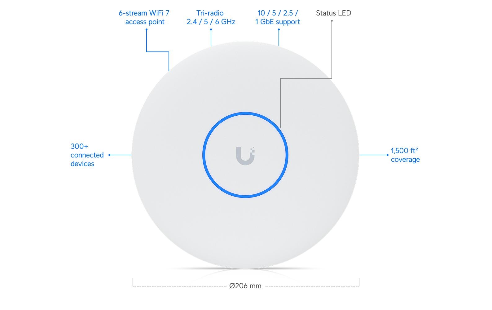 Avec une connexion Ethernet 10 gigabits intégrée, le U7 Pro XG s'intègre parfaitement dans les infrastructures réseau exigeantes. Il est idéal pour les applications professionnelles nécessitant une large bande passante, comme les grands bureaux, les établissements d'enseignement ou les salles de spectacle. L'alimentation électrique s'effectue aisément via PoE+ (Power over Ethernet), ce qui permet un montage flexible.