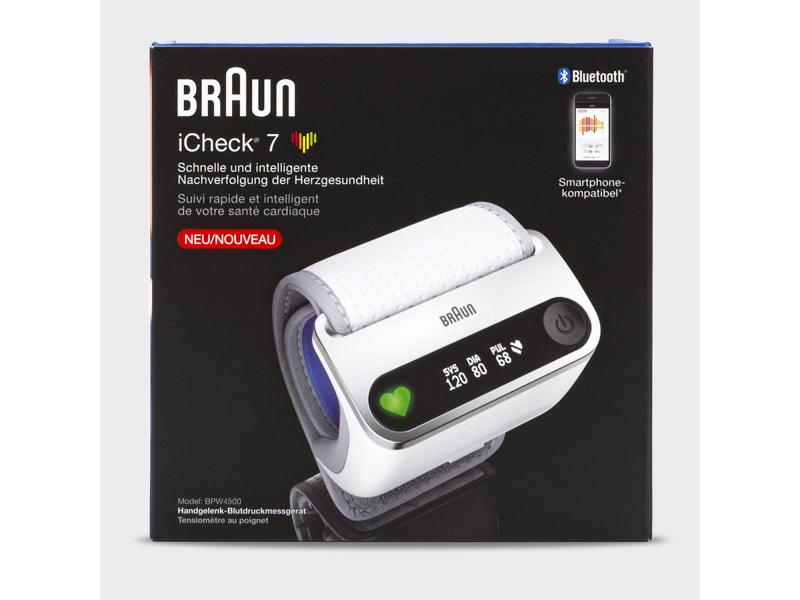 Le tensiomètre iCheck 7 de Braun permet de mesurer rapidement la pression artérielle au poignet. Grâce au système de joint à rotule, le tensiomètre peut être facilement positionné. Grâce aux résultats de mesure codés par couleur et à l'affichage pratique, vous avez toujours une vue claire de vos valeurs et pouvez les classer facilement. Le brassard est gonflé et dégonflé automatiquement. L'appareil est alimenté par deux piles AAA. Vous pouvez transférer les valeurs mesurées via Bluetooth à l'application "Braun Healthy Heart" sur les appareils iPad, iPhone et Android.