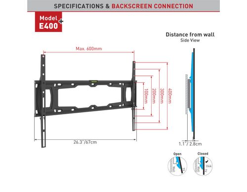 Flexibilité: fixe, Couleur: Noir, Support VESA: 100x100 mm; 100x200 mm; 200x100 mm; 200x200 mm; 300x300 mm; 400x300 mm; 400x400 mm; 600x400 mm, Charge maximale: 60 kg, Pour diagonale d'écran: 32"; 34"; 35"; 37"; 40"; 43"; 46"; 48"; 49"; 50"; 55"; 58"; 60"; 65"; 70"; 75"; 77"; 82"; 84"; 85"; 86"; 88"