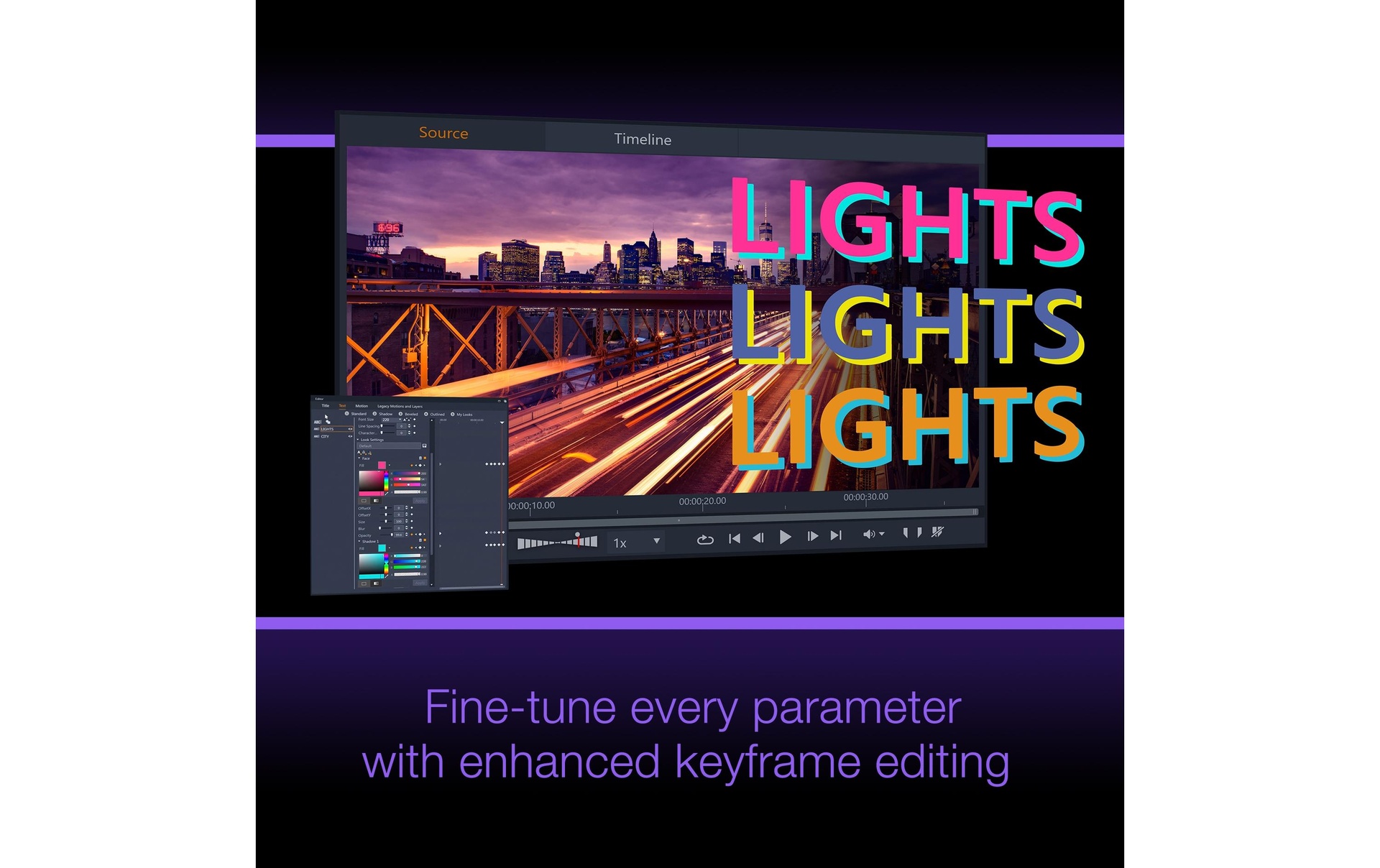 Repoussez les limites des images clés traditionnelles et contrôlez précisément chaque paramètre individuel de vos modifications: position, taille, vitesse, incrustations, transitions, effets, etc. Adaptez votre espace de travail à vos préférences d'édition personnelles: définissez des raccourcis personnalisés d’outils, groupez et modifiez simultanément des clips et découvrez un flux de travail simplifié avec une stabilité et une fiabilité du produit meilleures que jamais.